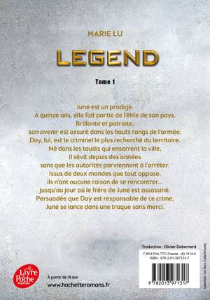 June est un prodige. A quinze ans, elle fait partie de l'élite de son pays. Brillante et patriote, son avenir est assuré dans les hauts rangs de l'armée. Day est le criminel le plus recherché du territoire. Né dans les taudis qui enserrent la ville, il sévit depuis des années sans que les autorités parviennent à l'arrêter. Issus de deux mondes que tout oppose, ils n'ont aucune raison de se rencontrer... jusqu'au jour où le frère de June est assassiné. Persuadée que Day est responsable de ce crime, June se lance dans une traque sans merci. Mais est-elle prête à découvrir la vérité ?