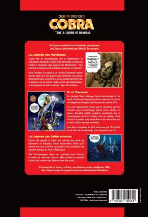 Trois histoires classiques de Cobra colorisées par Buichi Terasawa avec en bonus, une histoire courte totalement inédite en France. - La légende des Mandrades : La redoutable Elizabeth Tucker ne libérera Secret, prise en otage, seulement si Cobra parvient à récupérer des mandrades, fleurs qui ont la particularité de pousser recouvertes de diamants ! - Or et Diamants : Cobra s'aventure sur la planète Dust où il veut mettre la main sur un convoi de diligence transportant cinq cents tonnes d'or. Mais le légendaire pirate se fait arrêter avant de pouvoir mettre son plan à exécution. Comment va-t-il se tirer de cette affaire ? - La Légende des belles errantes : Cobra est sur la piste d'un fabuleux trésor sous-marin. Il fait la rencontre d'Eris Llyod, étudiante en histoire antique, qui l'accompagnera dans son aventure. Mais quelqu'un semble vouloir mettre des bâtons dans les roues de l'homme au psychogun...
