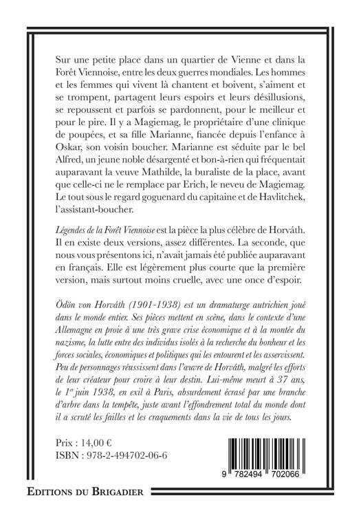 Sur une petite place dans un quartier de Vienne et dans la Forêt Viennoise, entre les deux guerres mondiales. Les hommes et les femmes qui vivent là chantent et boivent, s’aiment et se trompent, partagent leurs espoirs et leurs désillusions, se repoussent et parfois se pardonnent, pour le meilleur et pour le pire. Il y a Magiemag, le propriétaire d’une clinique de poupées, et sa fille Marianne, fiancée contre son gré à Oskar, son voisin boucher. Marianne est séduite par le bel Alfred, un jeune noble désargenté et bon-à-rien qui fréquentait auparavant chez la veuve Mathilde, la buraliste de la place, avant que celle-ci ne le remplace par Erich, le neveu de Magiemag. Le tout sous le regard goguenard du capitaine et de Havlitchek, l’assistant-boucher. Légendes de la Forêt Viennoise est, avec Casimir et Caroline, la pièce la plus célèbre de Horvath. Il en existe deux versions, assez différentes. La seconde que nous vous présentons ici, n’avait jamais été publiée auparavant en français. Elle est légèrement plus courte que la première version, mais surtout moins cruelle et avec une once d’espoir.