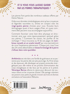 Et si vous vous laissiez guider par les pierres thérapeutiques ? Les pierres font partie des nombreux cadeaux offerts par Dame Nature. Grâce aux données minéralogiques ainsi qu’aux croyances et légendes racontées ici, entrez en contact avec les vingt-quatre pierres choisies pour vous. Écoutez leurs témoignages quant à leurs usages d’hier, et voyez comment elles peuvent vous accompagner aujourd’hui. Comment favoriser votre bien-être physique et émotionnel, ainsi que votre épanouissement spirituel grâce aux pierres ? Comment les choisir, les purifier et les recharger ? Vous trouverez au fil de ces pages de nombreux conseils et un oracle intuitif qui vous permettront de vivre l’expérience pleinement. Chaque jour, tirez l’une des 24 cartes détachables et laissez le message de la pierre s’infuser dans votre quotidien.