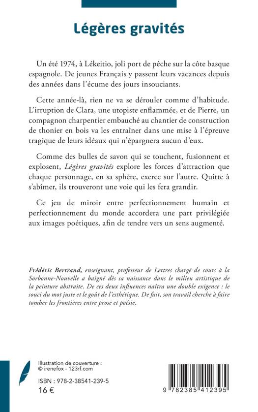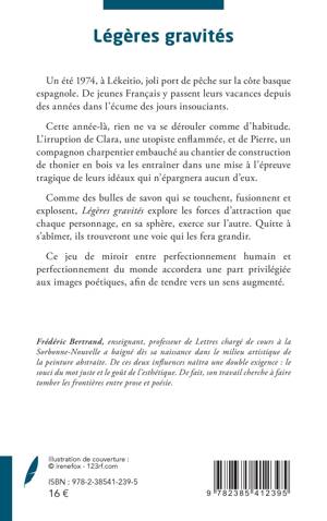 Un été 1974, à Lékeitio, joli port de pêche sur la côte basque espagnole. De jeunes Français y passent leurs vacances depuis des années dans l'écume des jours insouciants. Cette année-là, rien ne va se dérouler comme d'habitude. L'irruption de Clara, une utopiste enflammée, et de Pierre, un compagnon charpentier embauché au chantier de construction de thonier en bois va les entraîner dans une mise à l'épreuve tragique de leurs idéaux qui n'épargnera aucun d'eux. Comme des bulles de savon qui se touchent, fusionnent et explosent, Légères gravités explore les forces d'attraction que chaque personnage, en sa sphère, exerce sur l'autre. Quitte à s'abîmer, ils trouveront une voie qui les fera grandir. Ce jeu de miroir entre perfectionnement humain et perfectionnement du monde accordera une part privilégiée aux images poétiques, afin de tendre vers un sens augmenté.