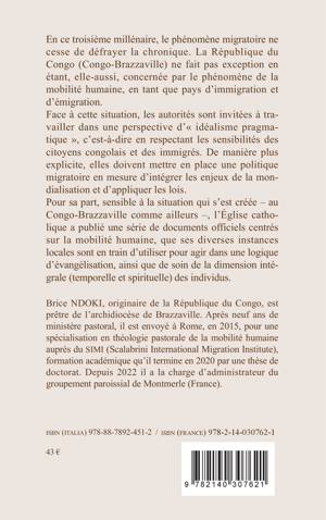 Comme de nombreux pays, la République du Congo est concernée par le phénomène de la mobilité humaine, en tant que pays d'immigration et d'émigration. Face à cette situation, les autorités doivent travailler dans une perspective d'« idéalisme pragmatique ». Pour sa part, l'Église catholique a publié une série de documents, que ses instances locales sont en train d'utiliser pour agir dans une logique d'évangélisation.