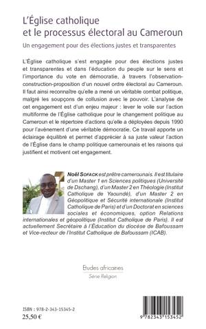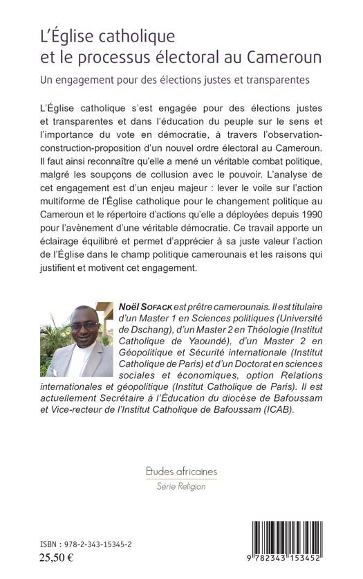 L'Eglise catholique s'est engagée pour des élections justes et transparentes et dans l'éducation du peuple, sur le sens et l'importance du vote en démocratie, à travers l'observation-construction-proposition d'un nouvel ordre électoral au Cameroun. Il faut ainsi reconnaître qu'elle a mené un véritable combat politique, malgré les soupçons de collusion avec le pouvoir. Ce travail apporte un éclairage équilibré et permet d'apprécier à sa juste valeur l'action de l'Eglise dans le champ politique camerounais et les raisons qui justifient et motivent cet engagement.