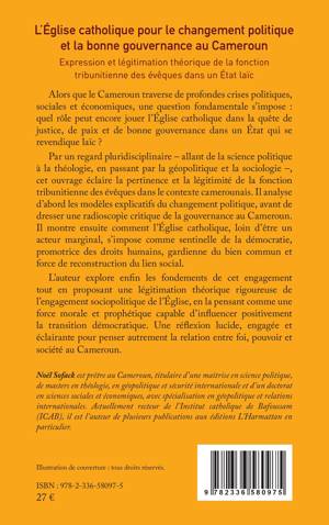 Alors que le Cameroun traverse de profondes crises politiques, sociales et économiques, une question fondamentale s'impose: quel rôle peut encore jouer l'Église catholique dans la quête de justice, de paix et de bonne gouvernance dans un État qui se revendique laïc ? Par un regard pluridisciplinaire - allant de la science politique à la théologie, en passant par la géopolitique et la sociologie -, cet ouvrage éclaire la pertinence et la légitimité de la fonction tribunitienne des évêques dans le contexte camerounais. Il analyse d'abord les modèles explicatifs du changement politique, avant de dresser une radioscopie critique de la gouvernance au Cameroun. Il montre ensuite comment l'Église catholique, loin d'être un acteur marginal, s'impose comme sentinelle de la démocratie, promotrice des droits humains, gardienne du bien commun et force de reconstruction du lien social. L'auteur explore enfin les fondements de cet engagement tout en proposant une légitimation théorique rigoureuse de l'engagement sociopolitique de l'Église, en la pensant comme une force morale et prophétique capable d'influencer positivement la transition démocratique. Une réflexion lucide, engagée et éclairante pour penser autrement la relation entre foi, pouvoir et société au Cameroun.