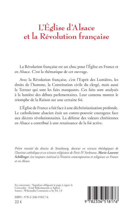 La Révolution française est un choc pour l'Église en France et en Alsace. C'est la thématique de cet ouvrage. Avec la Révolution française, c'est l'Esprit des Lumières, les droits de l'homme, la Constitution civile du clergé, mais aussi la Terreur qui sont les faits marquants. Ces faits sont analysés à la lumière des débats parlementaires. Leur contenu montre le triomphe de la Raison sur une certaine foi. L'Église de France a fait face à une déchristianisation profonde. Le catholicisme alsacien était un contre-pouvoir courageux face aux décrets révolutionnaires. La défense des valeurs chrétiennes en Alsace a contribué à une renaissance de la foi active.