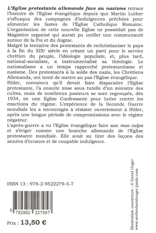 L’Eglise protestante allemande face au nazisme re-trace l’histoire de l’Eglise évangélique depuis que Martin Luther s’offusqua des campagnes d’indulgences prêchées pour alimenter les fastes de l’Eglise Catholique Romaine. L’organisation de cette nouvelle Eglise ne possédait pas de Magistère organisé qui aurait pu unifier une communauté autour de la Foi et du dogme. Malgré la tentative des protestants de rechristianiser le pays à la fin du XIXe siècle en créant un parti pour le service chrétien du peuple, l’idéologie populiste, et, plus tard, national-socialiste, a instrumentalisé sa théologie. Le nationalisme a un temps rapproché protestantisme et nazisme. Des protestants à la solde des nazis, les Chrétiens Allemands, ont tenté de mettre au pas l’Eglise évangélique. Hitler, convaincu qu’il devait faire disparaître l’Eglise protestante, l’a ensuite mise sous tutelle d’un ministre des cultes, mais de nombreux pasteurs se sont regroupés, dès 1934, en une Eglise Confessante pour lutter contre les exactions du régime. L’expérience de la Seconde Guerre mondiale les a encouragés à résister ouvertement à Hitler, après une longue période de compromissions avec le régime négateur. L’après-guerre a vu l’Eglise évangélique faire son mea culpa et s’ériger comme une branche allemande de l’Eglise protestante mondiale. Elle avait su tirer des leçons des années d’errance et de coupable indulgence.