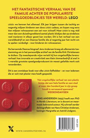 LEGO van biograaf Jens Andersen is het sprookjesachtige verhaal van de familie achter de populairste speelgoedblokjes ter wereld. Voor het eerst stemde de familie Kirk Christiansen ermee in om hun levensverhaal te vertellen en Andersen, die eerder de biografieën van o.a. Hans Christian Andersen en Astrid Lindgren schreef, kreeg als allereerste toegang tot hun persoonlijke archief. In LEGO vertelt hij in zijn kenmerkende levendige stijl hoe een timmerman uit Billund de basis legde voor een wereldwijd geliefd speelgoedmerk, en de obstakels die hij, maar ook de generaties na hem moesten overwinnen. Naast een fascinerende familiegeschiedenis is dit ook een culturele reis door de tijd: over een veranderende kijk op kinderen, hun speelgoed en de manieren van spelen gedurende een hele eeuw.