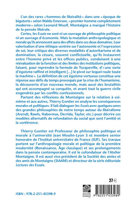 Une analyse de la dimension egoiste de la personnalite de Montaigne, prise dans un sens moral, qui romprait avec la traditionnelle emprise de la sphere publique sur le prive, posant les jalons d'une pensee liberale. Il confronte la pensee du philosophe a celle d'Habermas, d'Arendt, de Derrida et de Rand pour en devoiler l'heritage.
