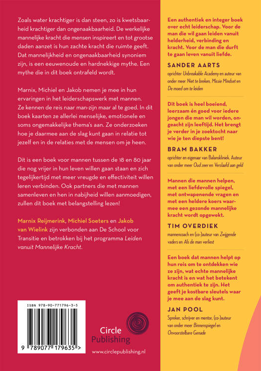Zoals water krachtiger is dan steen, zo is kwetsbaarheid krachtiger dan ongenaakbaarheid. De werkelijke mannelijke kracht die mensen inspireert en tot grootse daden aanzet is hun zachte kracht die ruimte geeft. Dat mannelijkheid en ongenaakbaarheid synoniem zijn, is een eeuwenoude en hardnekkige mythe. Een mythe die in dit boek ontrafeld wordt. Marnix, Michiel en Jakob nemen je mee in hun ervaringen in het leiderschapswerk met mannen. Ze kennen de reis naar man-zijn maar al te goed. In dit boek kaarten ze allerlei menselijke, emotionele en soms ongemakkelijke thema's aan. Ze onderzoeken hoe je daarmee aan de slag kunt gaan in relatie tot jezelf en in de relaties met de mensen om je heen. Dit is een boek voor mannen tussen de 18 en 80 jaar die nog vrijer in hun leven willen gaan staan en zich tegelijkertijd met meer vreugde en effectiviteit willen leren verbinden. Ook partners die met mannen samenleven en hen in nabijheid willen aanmoedigen, zullen dit boek met belangstelling lezen!