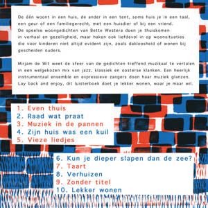 De één woont in een huis, de ander in een tent, soms huis je in een taal, een geur of een familiegerecht, met een huisdier of bij een vriend. De speelse woongedichten van Bette Westera doen je thuiskomen in verhaal en gezelligheid, maar haken ook liefdevol in op woonsituaties die voor kinderen niet altijd evident zijn, zoals dakloosheid of wonen bij gescheiden ouders. Mirjam de Wit weet de sfeer van de gedichten treffend muzikaal te vertalen in een welgekozen mix van jazz, klassiek en oosterse klanken. Een heerlijk instrumentaal ensemble en expressieve zangers doen haar muziek glanzen. Lay back and enjoy, dit luisterboek doet je lekker wonen, waar je maar wil.