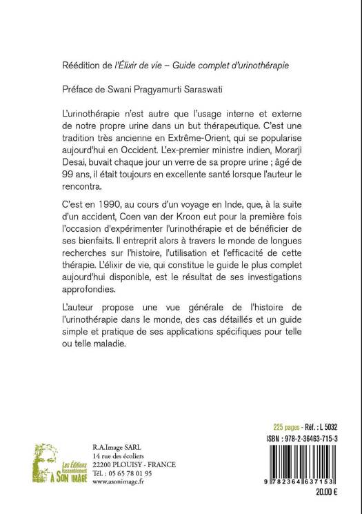 Témoignages à l'appui, le guide de la thérapeutique la plus disponible, gratuite au monde. Préface de Swani Pragyamurti Saraswati L'urinothérapie n'est autre que l'usage interne et externe de notre propre urine dans un but thérapeutique. C'est une tradition très ancienne en Extrême-Orient, qui se popularise aujourd'hui en Occident. L'auteur propose une vue générale de l'histoire de l'urinothérapie dans le monde, des cas détaillés et un guide simple et pratique de ses applications spécifiques pour telle ou telle maladie, témoignages à l'appui. Si l'urinothérapie est le sujet de débats animés, il est néanmoins un point sur lequel tout le monde s'accorde : elle est absolument gratuite !