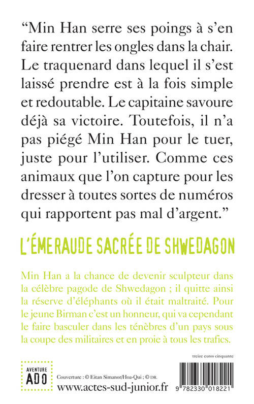 Birmanie, 1993. Le pays est sous le joug militaire et la leader politique Aung San Suu Kyi assignée à résidence. Dans ce contexte troublé, le jeune Min Han, sculpteur à la célèbre pagode de Shwedagon, est mêlé malgré lui à un terrible complot visant à s'emparer de l'émeraude sacrée du temple. Cette machination l'entraînera loin des siens, en plein coeur du Triangle d'or. Pour survivre, il deviendra oozie (dresseur d'éléphants), puis passeur d'opium pour des contrebandiers à la frontière thaïlandaise...
