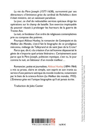 La vie du Pere Joseph (1577-1638), surnomme par ses detracteurs l'eminence grise du cardinal de Richelieu dont il etait ministre, est un saisissant paradoxe. Le jour, ce chef de redoutables services speciaux dirige les operations sur le champ de bataille. Son exercice impitoyable du pouvoir reussit a prolonger les horreurs de la guerre de Trente Ans. La nuit, ce fondateur d'un ordre de religieuses contemplatives prie ou compose des poemes. Pourquoi Aldous Huxley, le romancier de Contrepoint et du Meilleur des Mondes, s'est-il fait le biographe de ce prodigieux meconnu, melange de Talleyrand et de saint Jean de la Croix ? Parce que, dit-il, la creation d'un tel homme depasserait le genie de n'importe quel artiste litteraire. Certainement aussi parce que le Pere Joseph, politicien mystique, s'est vu, le jour comme la nuit, en batisseur d'un monde meilleur...