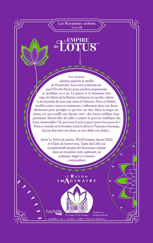 Après Le Trône de jasmin, World Fantasy Award 2022, et L’Épée de laurier-rose, Tasha Suri clôt son exceptionnelle épopée des Royaumes ardents dans un troisième volet captivant, où politique, magie et romance s’entremêlent.