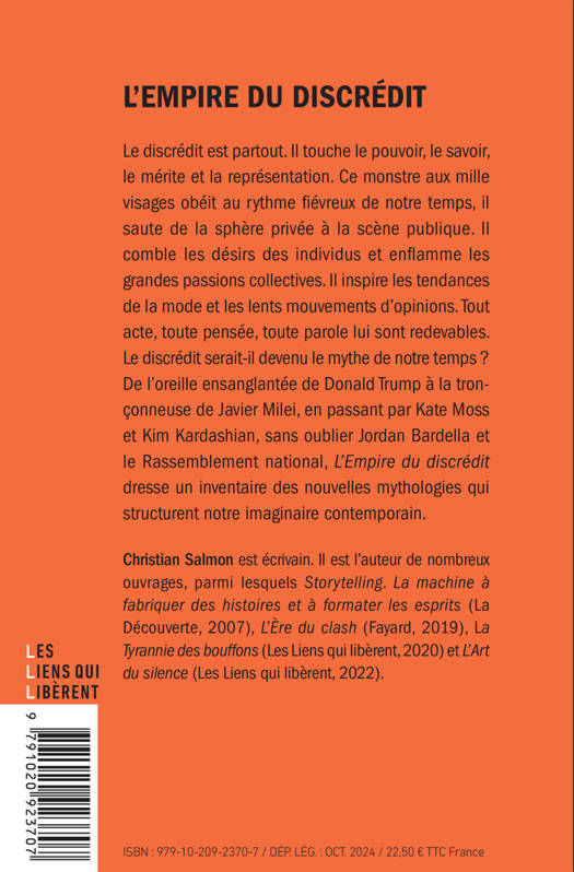 Le discrédit est partout. Discrédit des formes de légitimité du pouvoir. Discrédit des langages autorisés. Discrédit du savoir, du mérite. Discrédit de la représentation. Ce monstre aux mille visages obéit au rythme fiévreux de notre temps, il saute de la sphère privée à la scène publique. Il comble les désirs des individus et enflamme les grandes passions collectives. Il inspire les tendances de la mode et les lents mouvements d'opinions. Tout acte, toute pensée, toute parole lui sont redevables. Mais le mutisme de l'époque est aussi son oeuvre. Il est le silence et le cri. L'émeute et l'effroi.