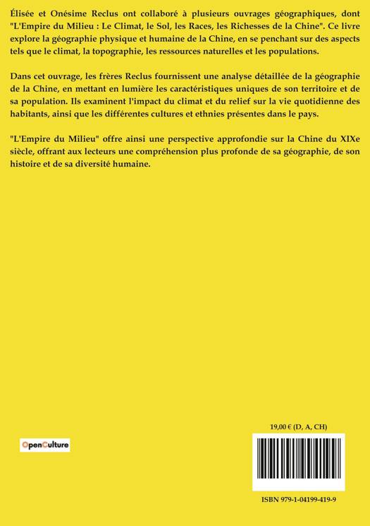 L'Empire du Milieu, vaste et mystérieux, s'étend sous le regard curieux des frères Reclus, Élisée et Onésime. Ce livre nous transporte au coeur de la Chine du XIXe siècle, une époque marquée par des bouleversements politiques et sociaux. Les auteurs, géographes et explorateurs de renom, nous offrent une description détaillée de ce pays en pleine mutation, alors en plein changement. À travers leurs yeux, nous découvrons les paysages variés, des montagnes majestueuses aux rivières sinueuses, ainsi que les coutumes et traditions d'un peuple marqué par l'histoire. Les Reclus s'attachent à dépeindre les modifications internes de la Chine, alors confrontée à l'influence croissante des puissances occidentales. Ils explorent les tensions entre tradition et modernité, mettant en lumière les défis auxquels le pays doit faire face. Ce récit géographique et historique nous plonge dans une analyse minutieuse des structures sociales et économiques de l'époque, tout en nous faisant voyager à travers les provinces chinoises. Les thématiques abordées dans cet ouvrage sont multiples: le changement culturel, les enjeux économiques, et les évolutions politiques. Les auteurs nous invitent à réfléchir sur l'impact de l'industrialisation et de l'ouverture au monde extérieur sur une civilisation millénaire. En développant une vue panoramique de la Chine, ce livre nous apprend à mieux comprendre les complexités d'un pays en plein bouleversement. Par leur étude rigoureuse et documentée, Élisée et Onésime Reclus nous offrent une perspective enrichissante sur la Chine du XIXe siècle. Ce livre est une invitation à découvrir un monde à la fois lointain et proche, dont les échos résonnent encore aujourd'hui.