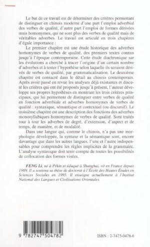 Le but de ce travail est de déterminer les critères permettant de distinguer en chinois moderne d'une part l'emploi adverbial des verbes de qualité, d'autre part l'emploi de formes dérivées mais homonymes, qui ne sont plus des verbes de qualité mais de véritables adverbes. Le premier chapitre est une étude historique des adverbes homonymes de verbes de qualité, des premiers textes connus jusqu'à l'époque contemporaine. Le deuxième chapitre est consacré dans le détail au chinois contemporain. Enfin, le troisième chapitre est une description des fonctions des adverbes de degré, d'extension, d'aspect de temps, de manière et de modalité.