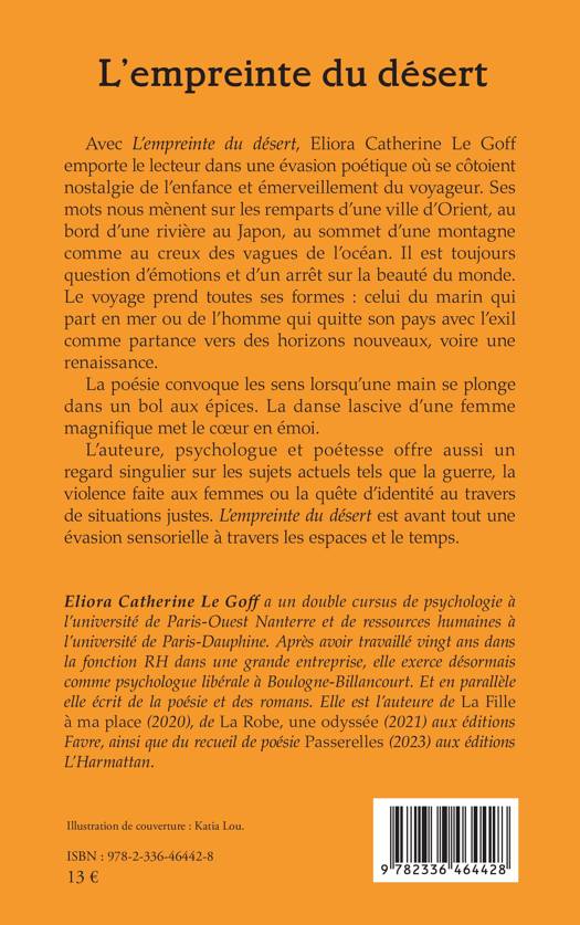 Avec L'empreinte du désert, Eliora Catherine Le Goff emporte le lecteur dans une évasion poétique où se côtoient nostalgie de l'enfance et émerveillement du voyageur. Ses mots nous mènent sur les remparts d'une ville d'Orient, au bord d'une rivière au Japon, au sommet d'une montagne comme au creux des vagues de l'océan. Il est toujours question d'émotions et d'un arrêt sur la beauté du monde. Le voyage prend toutes ses formes celui du marin qui part en mer ou de l'homme qui quitte son pays avec l'exil comme partance vers des horizons nouveaux, voire une renaissance. La poésie convoque les sens lorsqu'une main se plonge dans un bol aux épices. La danse lascive d'une femme magnifique met le coeur en émoi. L'auteure, psychologue et poétesse offre aussi un regard singulier sur les sujets actuels tels que la guerre, la violence faite aux femmes ou la quête d'identité au travers de situations justes. L'empreinte du désert est avant tout une évasion sensorielle à travers les espaces et le temps.