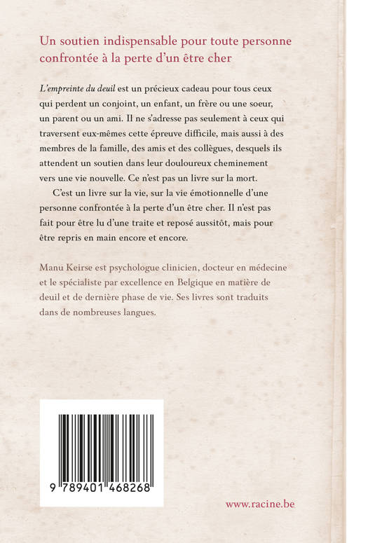 L'empreinte du deuil est un précieux cadeau à offrir à quelqu'un ou à soi-même. C'est un petit livre qui devrait être lu par tout un chacun qui perd un enfant, un partenaire, un frère ou une soeur, un parent ou un ami. Il ne s'adresse pas seulement à ceux qui traversent eux-mêmes une épreuve difficile, mais aussi à des membres de la famille, des amis et des collègues desquels ils attendent un soutien dans leur douloureux cheminement vers une vie nouvelle. Ce n'est pas un livre sur la mort.
