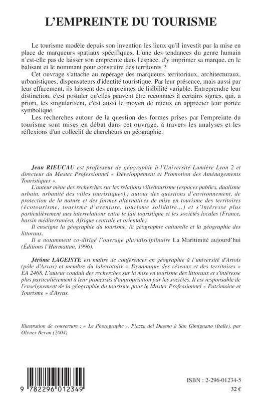 Le tourisme modèle depuis son invention les lieux qu'il investit par la mise en place de marqueurs spatiaux spécifiques. Cet ouvrage s'attache au repérage des marqueurs territoriaux, architecturaux, urbanistiques, dispensateurs d'identité touristique. Par leur présence, mais aussi par leur effacement, ils laissent des empreintes de lisibilité variable. Un ensemble de contributions sur l'empreinte du tourisme sont ici mises en débat par un collectif de géographes.