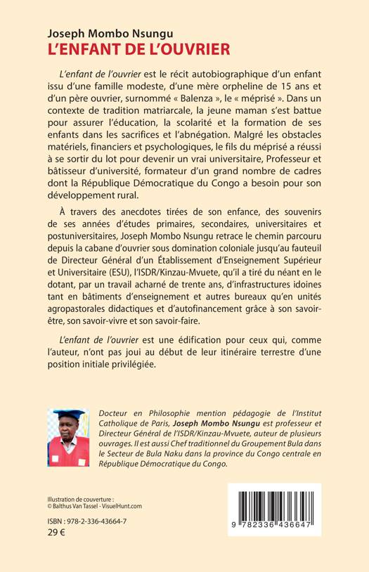 L’enfant de l’ouvrier est le récit autobiographique d’un enfant issu d’une famille modeste, d’une mère orpheline de 15 ans et d’un père ouvrier, surnommé « Balenza », le « méprisé ». Dans un contexte de tradition matriarcale, la jeune maman s’est battue pour assurer l’éducation, la scolarité et la formation de ses enfants dans les sacrifices et l’abnégation. Malgré les obstacles matériels, financiers et psychologiques, le fils du méprisé a réussi à se sortir du lot pour devenir un vrai universitaire, Professeur et bâtisseur d’université, formateur d’un grand nombre de cadres dont la République Démocratique du Congo a besoin pour son développement rural. À travers des anecdotes tirées de son enfance, des souvenirs de ses années d’études primaires, secondaires, universitaires et postuniversitaires, Joseph Mombo Nsungu retrace le chemin parcouru depuis la cabane d’ouvrier sous domination coloniale jusqu’au fauteuil de Directeur Général d’un Établissement d’Enseignement Supérieur et Universitaire (ESU), l’ISDR/Kinzau-Mvuete, qu’il a tiré du néant en le dotant, par un travail acharné de trente ans, d’infrastructures idoines tant en bâtiments d’enseignement et autres bureaux qu’en unités agropastorales didactiques et d’autofinancement grâce à son savoir-être, son savoir-vivre et son savoir-faire. L’enfant de l’ouvrier est une édification pour ceux qui, comme l’auteur, n’ont pas joui au début de leur itinéraire terrestre d’une position initiale privilégiée.