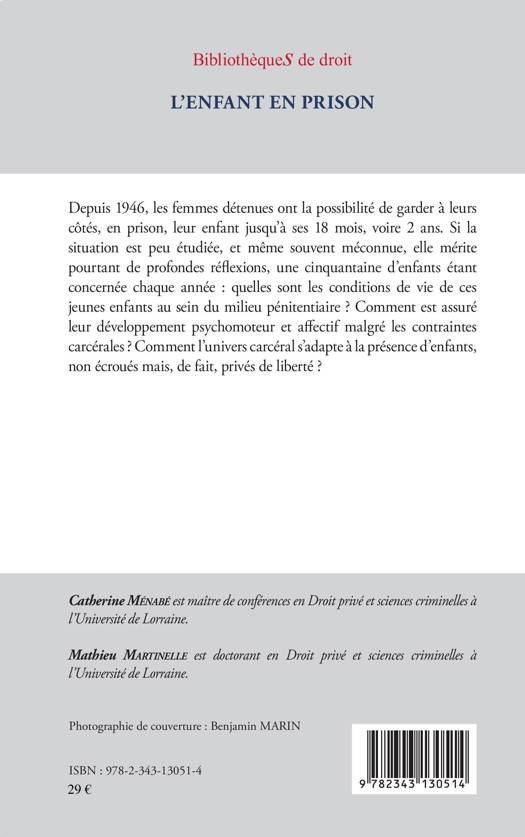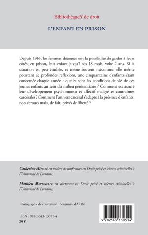 Depuis 1946, les femmes détenues ont la possibilité de garder à leurs côtés, en prison, leur enfant jusqu'à ses 18 mois, voire 2 ans. Si la situation est peu étudiée, et souvent méconnue, elle mérite de profondes réflexions. Quelles sont les conditions de vie de ces jeunes enfants au sein du milieu pénitentiaire ? Comment est assuré leur développement psychomoteur et affectif malgré les contraintes carcérales ? Comment l'univers carcéral s'adapte à la présence d'enfants, non écroués mais, de fait, privés de liberté ?