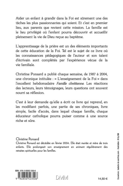Aider un enfant à grandir dans la Foi est sûrement une des tâches les plus passionnantes qui soient. Et c'est, en premier lieu, aux parents que revient cette mission. La famille est le lieu privilégié où l'enfant pourra découvrir et accueillir pleinement la vie de Dieu repue au baptême. L'apprentissage de la prière est un des éléments importants de cette éducation de la Foi. Tel est le sujet de ce livre où les connaissances pédagogiques de l'auteur et son talent d'écrivain sont complétés par l'expérience vécue de la vie familiale. Christine Ponsard donnait, chaque semaine de 1987 à 2003, une chronique intitulée : L'enseignement de la Foi, dans l'hebdomadaire Famille Chrétienne. Les réactions des lecteurs ont, souvent, nourri la réflexion de l'auteur par leurs témoignages et leurs questions. Ce livre reprend, en les modifiant parfois, une partie de ces chroniques. Un livre simple, accessible à tous et où chaque famille, chaque éducateur pourra puiser comme à une source riche et sûre.