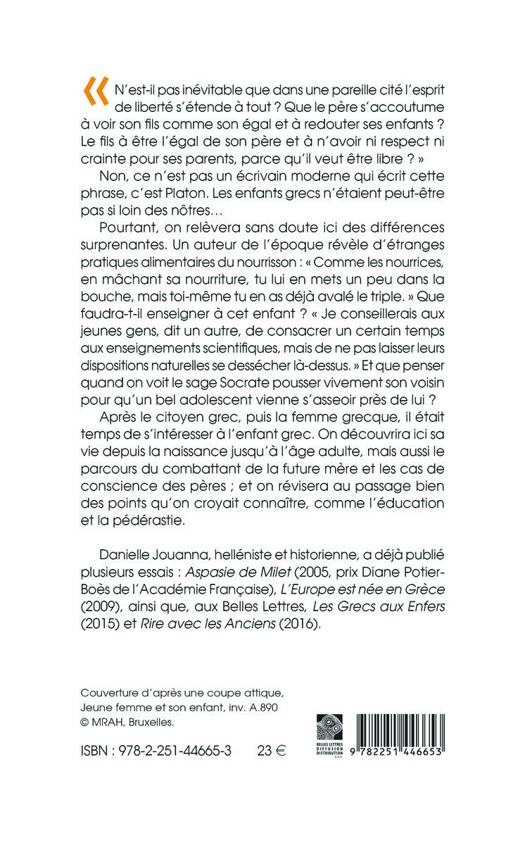 N'est-il pas inevitable que dans une pareille cite l'esprit de liberte s'etende a tout ? Que le pere s'accoutume a voir son fils comme son egal et a redouter ses enfants ? Le fils a etre l'egal de son pere et a n'avoir ni respect ni crainte pour ses parents, parce qu'il veut etre libre ? Non, ce n'est pas un ecrivain moderne qui ecrit cette phrase, c'est Platon. Les enfants grecs n'etaient peut-etre pas si loin des notres... Pourtant, on relevera sans doute ici des differences surprenantes. Un auteur de l'epoque revele d'etranges pratiques alimentaires du nourrisson: Comme les nourrices, en machant sa nourriture, tu lui en mets un peu dans la bouche, mais toi-meme tu en as deja avale le triple. Que faudra-t-il enseigner a cet enfant ? Je conseillerais aux jeunes gens, dit un autre, de consacrer un certain temps aux enseignements scientifiques, mais de ne pas laisser leurs dispositions naturelles se dessecher la-dessus. Et que penser quand on voit le sage Socrate pousser vivement son voisin pour qu'un bel adolescent vienne s'asseoir pres de lui ? Apres le citoyen grec, puis la femme grecque, il etait temps de s'interesser a l'enfant grec. On decouvrira ici sa vie depuis la naissance jusqu'a l'age adulte, mais aussi le parcours du combattant de la future mere et les cas de conscience des peres; et on revisera au passage bien des points qu'on croyait connaitre, comme l'education et la pederastie.