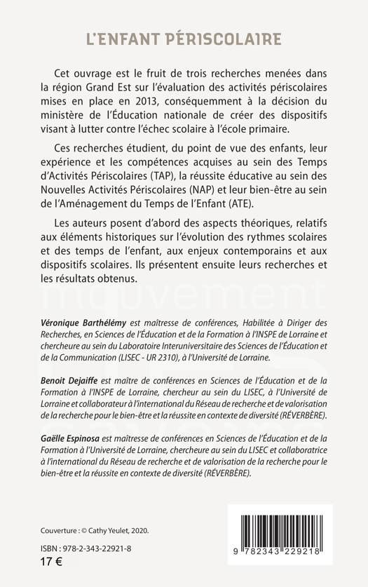 Cet ouvrage est le fruit de trois recherches menées dans la région Grand Est sur l'évaluation des activités périscolaires mises en place en 2013, conséquemment à la décision du ministère de l'Éducation nationale de créer des dispositifs visant à lutter contre l'échec scolaire à l'école primaire. Ces recherches étudient, du point de vue des enfants, leur expérience et les compétences acquises au sein des Temps d'Activités Périscolaires (TAP), la réussite éducative au sein des Nouvelles Activités Périscolaires (NAP) et leur bien-être au sein de l'Aménagement du Temps de l'Enfant (ATE). Les auteurs posent d'abord des aspects théoriques, relatifs aux éléments historiques sur l'évolution des rythmes scolaires et des temps de l'enfant, aux enjeux contemporains et aux dispositifs scolaires.