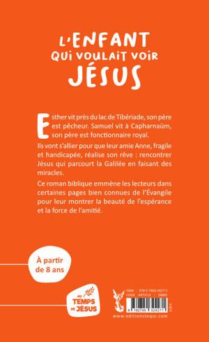 Esther vit près du lac de Tibériade, son père est pêcheur. Samuel vit à Capharnaüm, son père est fonctionnaire royal. Ils n’ont rien en commun et ne se connaissent pas, et pourtant, ils vont se lier et tout faire pour que leur amie Anne, fragile et handicapée, réalise son rêve : rencontrer Jésus. Mais ce n’est pas si facile de poursuivre un tel but quand on a tout juste 10 ans. Où trouver cet homme qui parcourt la Galilée et qui fait des miracles ? Et comment faire pour qu’Anne, le rencontre ? Esther et Samuel cherchent à suivre les pas de ce Jésus dont tout le monde parle, mais parviendront-ils à réaliser le rêve de leur amie ? Si nous avions pu vivre au temps des apôtres et voir Jésus en vrai, comment aurions-nous réagi ? Ce roman biblique pour les enfants à partir de 8 ans montre aux lecteurs la beauté de l’espérance et la force de l’amitié.