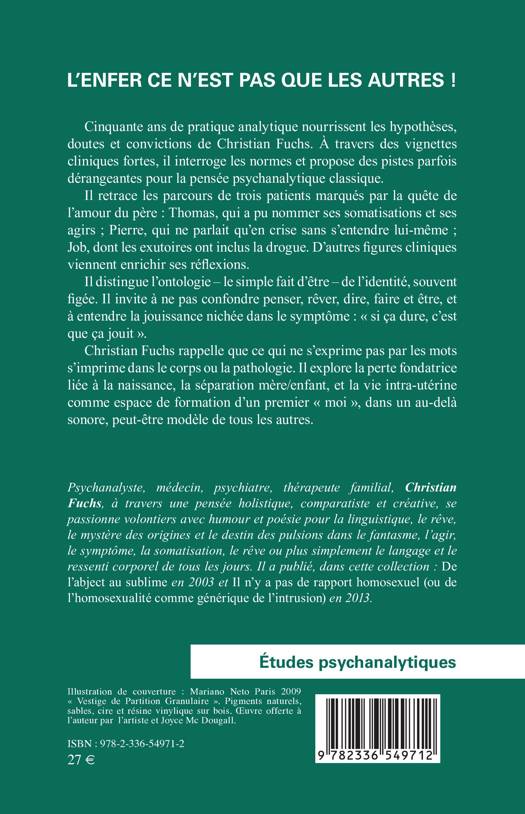 Cinquante ans de pratique analytique nourrissent les hypothèses, doutes et convictions de Christian Fuchs. À travers des vignettes cliniques fortes, il interroge les normes et propose des pistes parfois dérangeantes pour la pensée psychanalytique classique. Il retrace les parcours de trois patients marqués par la quête de l'amour du père: Thomas, qui a pu nommer ses somatisations et ses agirs; Pierre, qui ne parlait qu'en crise sans s'entendre lui-même; Job, dont les exutoires ont inclus la drogue. D'autres figures cliniques viennent enrichir ses réflexions. Il distingue l'ontologie - le simple fait d'être - de l'identité, souvent figée. Il invite à ne pas confondre penser, rêver, dire, faire et être, et à entendre la jouissance nichée dans le symptôme: si ça dure, c'est que ça jouit . Christian Fuchs rappelle que ce qui ne s'exprime pas par les mots s'imprime dans le corps ou la pathologie. Il explore la perte fondatrice liée à la naissance, la séparation mère/enfant, et la vie intra-utérine comme espace de formation d'un premier moi, dans un au-delà sonore, peut-être modèle de tous les autres.