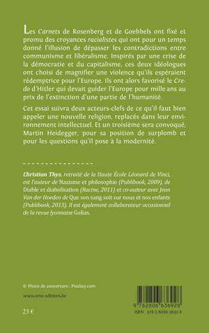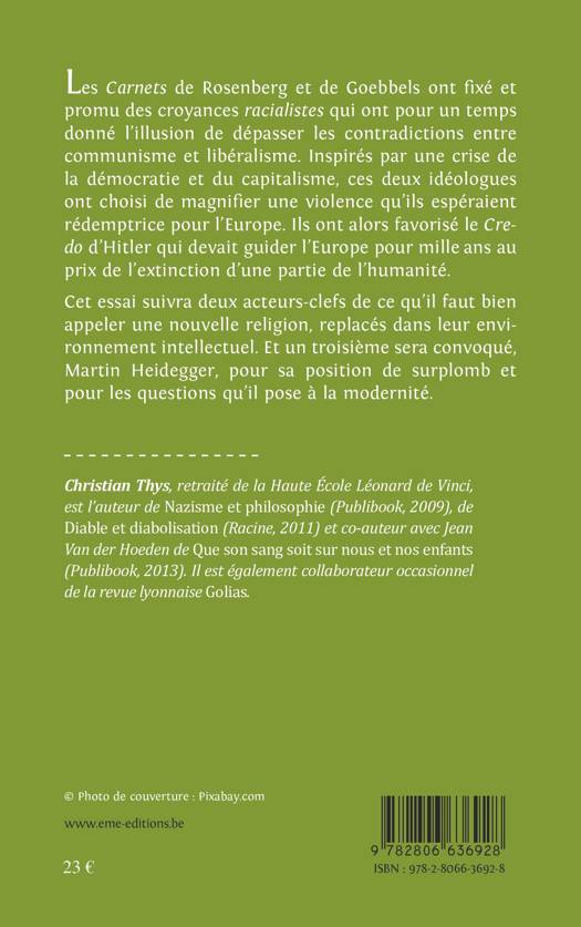 « Goebbels, c'est du pus ! » s'exclame son complice Rosenberg à l'adresse de celui que l'Observatore romano appellera le « cannibale sanguinaire ». Christian Thys suit le parcours intellectuel des deux complices d'une tragédie mondiale par le détournement de la tradition populaire, des philosophes, des médecins, des juristes et des anthropologues, pour se forger une foi inébranlable en une rédemption de l'Allemagne au mépris du reste du monde.