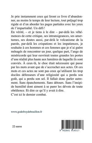 Je prie instamment ceux qui liront ce livre d’abandonner, au moins le temps de leur lecture, tout préjugé trop rigide et d’en aborder les pages partiales avec les yeux de l’impartialité. Un défi ! En vérité, – et je tiens à le dire – par-delà les véhémences de cette critique, ses intransigeances, ses amertumes, ses doutes aussi, par-delà le volcanisme de la parole, par-delà les crispations et les impatiences, je souhaite à ces hommes et ces femmes que je n’ai guère ménagés de rencontrer un jour, quelque part, l’ange de miséricorde qui leur ouvrirait toutes grandes les portes d’une réalité plus haute aux lumières de laquelle ils sont conviés. À ceux-là, le choc était nécessaire qui passe par les mots avant que de s’accrocher aux actes. Or ces mots et ces actes ne sont pas ceux qu’utilisent les trop dociles défenseurs d’une religiosité qui a perdu son goût, qui a perdu son sel. Il fallait donc parler autrement. Sans épanchements. Sans détours. Sans l’insipide humilité dont aiment à se parer les dévots de toute obédience. Et dire ce qu’il y avait à dire. C’est ici le dernier combat.