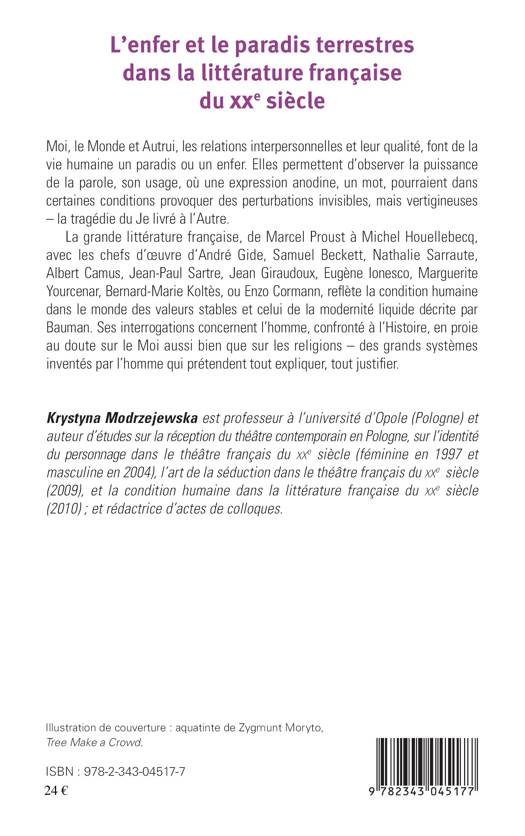 La grande littérature française, de Marcel Proust à Michel Houellebecq, avec les chefs d'oeuvre d'André Gide, Samuel Beckett, Nathalie Sarraute, Albert Camus, Jean-Paul Sartre, Jean Giraudoux, Eugène Ionesco, Marguerite Yourcenar, Bernard-Marie Koltès, ou Enzo Cormann, reflète la condition humaine dans le monde des valeurs stables et celui de la modernité liquide décrite par Bauman. Ses interrogations concernent l'homme, confronté à l'Histoire, en proie au doute sur le Moi aussi bien que sur les religions.