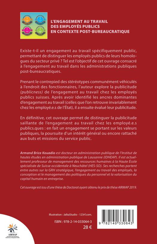 Existe-t-il un engagement au travail spécifiquement public, permettant de distinguer les employés publics de leurs homologues du secteur privé ? Tel est l'objectif de cet ouvrage consacré à l'engagement au travail dans les administrations publiques post-bureaucratiques. Prenant le contrepied des stéréotypes communément véhiculés à l'endroit des fonctionnaires, l'auteur explore la publicitude (publicness) de l'engagement au travail chez les employés publics suisses. Après avoir identifié les ancres dominantes d'engagement au travail (celles que l'on retrouve invariablement chez les employé.e.s de l'État), il a ensuite évalué leur publicitude. En définitive, cet ouvrage permet de distinguer la publicitude saillante de l'engagement au travail chez les employé.e.s publics.ques : en fait un engagement se portant sur les valeurs publiques, la poursuite d'un intérêt général ou encore rattaché aux buts et missions du service public. Cet ouvrage est issu d'une thèse de Doctorat ayant obtenu le prix de thèse AIRMAP 2019.