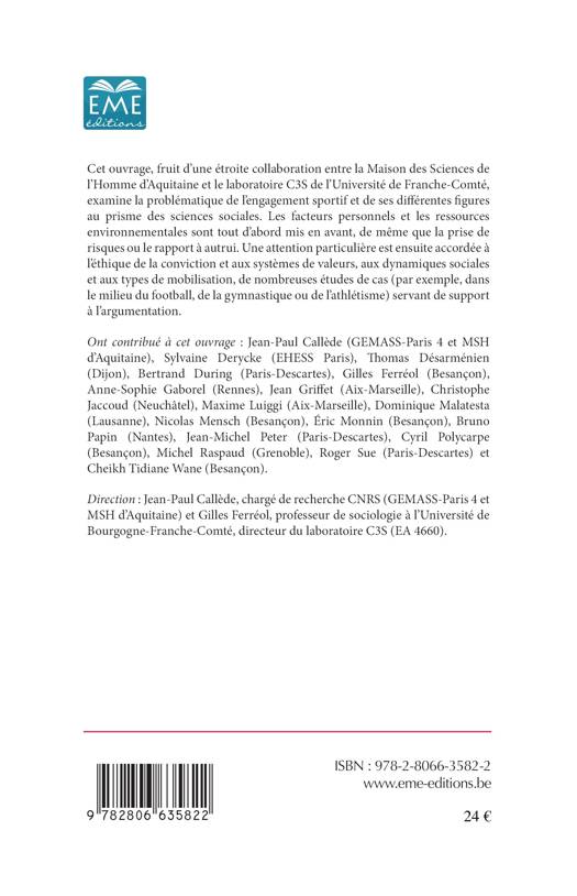 Cet ouvrage examine la problématique de l'engagement sportif et de ses différentes figures au prisme des sciences sociales. Les facteurs personnels et les ressources environnementales sont mis en avant, comme la prise de risques ou le rapport à autrui. Une attention particulière est accordée à l'éthique de la conviction et aux systèmes de valeurs, aux dynamiques sociales et aux types de mobilisation, de nombreuses études de cas (exemple, dans le milieu du football) servant de support à l'argumentation.