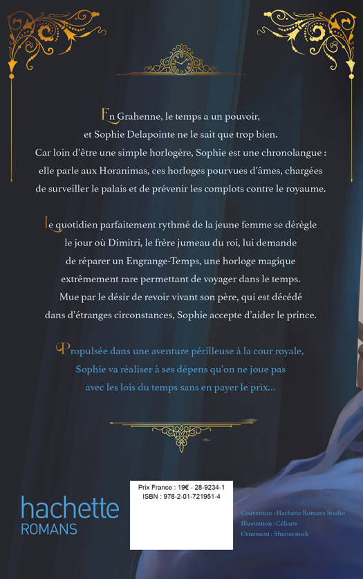 En Grahenne, le temps a un pouvoir, et Sophie Delapointe ne le sait que trop bien. Car loin d’être une simple horlogère, Sophie est une chronolangue : elle parle aux Horanimas, ces horloges pourvues d’âmes, chargées de surveiller le palais et de prévenir les complots contre le royaume. Le quotidien parfaitement rythmé de la jeune femme se dérègle le jour où Dimitri, le frère jumeau du roi, lui demande de réparer un Engrange-Temps, une horloge magique extrêmement rare permettant de voyager dans le temps. Mue par le désir de revoir vivant son père, qui est décédé dans d’étranges circonstances, Sophie accepte d’aider le prince. Propulsée dans une aventure périlleuse à la cour royale, Sophie va réaliser à ses dépens qu’on ne joue pas avec les lois du temps sans en payer le prix…