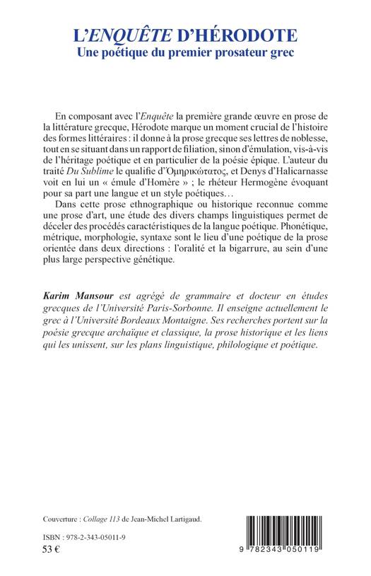 En composant avec l'Enquête la première grande uvre en prose de la littérature grecque, Hérodote marque un moment crucial de l'histoire des formes littéraires : il donne à la prose grecque ses lettres de noblesse. Dans cette prose ethnographique ou historique reconnue comme une prose d'art, une étude des divers champs linguistiques permet de déceler des procédés caractéristiques de la langue poétique.