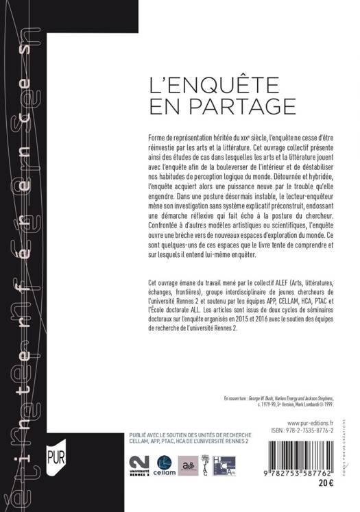 Forme de représentation héritée du e siècle, l’enquête ne cesse d’être réinvestie par les arts et la littérature. Cet ouvrage collectif présente ainsi des études de cas dans lesquelles les arts et la littérature jouent avec l’enquête afin de la bouleverser de l’intérieur et de déstabiliser nos habitudes de perception logique du monde. Détournée et hybridée, l’enquête acquiert alors une puissance neuve par le trouble qu’elle engendre. Dans une posture désormais instable, le lecteur-enquêteur mène son investigation sans système explicatif préconstruit, endossant une démarche réflexive qui fait écho à la posture du chercheur. Confrontée à d’autres modèles artistiques ou scientifiques, l’enquête ouvre une brèche vers de nouveaux espaces d’exploration du monde. Ce sont quelques-uns de ces espaces que le livre tente de comprendre et sur lesquels il entend lui-même enquêter.