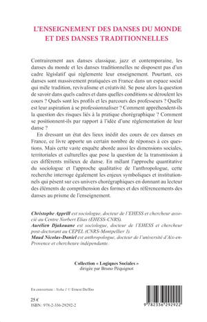 Les danses du monde et les danses traditionnelles ne disposent pas d'un cadre législatif qui réglemente leur enseignement. Pourtant, ces danses sont massivement pratiquées en France dans un espace social qui mêle tradition, revivalisme et créativité. Dans quels cadres se déroulent les cours ? Quels sont les profils des professeurs ? Comment appréhendent-ils la question des risques liés à la pratique chorégraphique ? Comment se positionnent-ils par rapport à l'idée d'une réglementation de leur danse ?