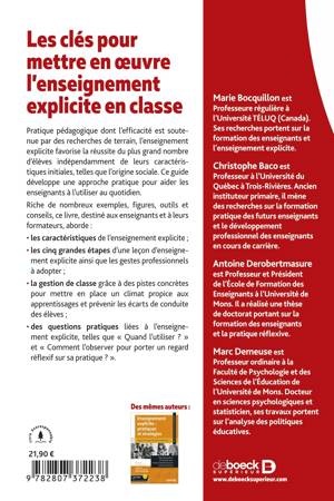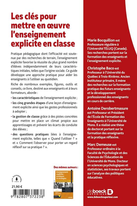 Pratique pédagogique dont l’efficacité est soutenue par des recherches de terrain, l’enseignement explicite favorise la réussite du plus grand nombre d’élèves indépendamment de leurs caractéristiques initiales, telles que l’origine sociale. Ce guide développe une approche pratique pour aider les enseignants à l’utiliser au quotidien.