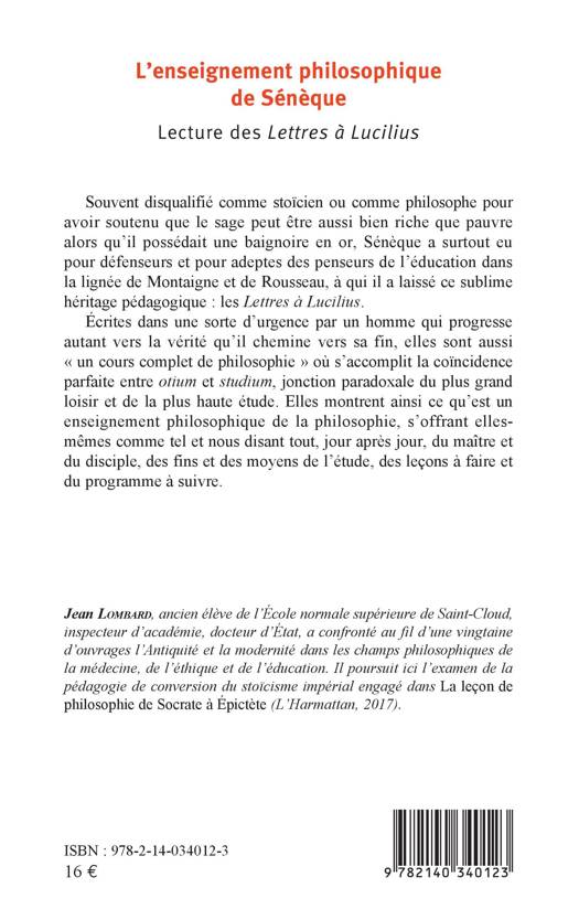 Souvent disqualifié comme stoïcien ou comme philosophe pour avoir soutenu que le sage peut être aussi bien riche que pauvre alors qu'il possédait une baignoire en or, Sénèque a surtout eu pour défenseurs et pour adeptes des penseurs de l'éducation dans la lignée de Montaigne et de Rousseau, à qui il a laissé ce sublime héritage pédagogique : les Lettres à Lucilius. Écrites dans une sorte d'urgence par un homme qui progresse autant vers la vérité qu'il chemine vers sa fin, elles sont aussi « un cours complet de philosophie » où s'accomplit la coïncidence parfaite entre otium et studium, jonction paradoxale du plus grand loisir et de la plus haute étude. Elles montrent ainsi ce qu'est un enseignement philosophique de la philosophie, s'offrant elles-mêmes comme tel et nous disant tout, jour après jour, du maître et du disciple, des fins et des moyens de l'étude, des leçons à faire et du programme à suivre.