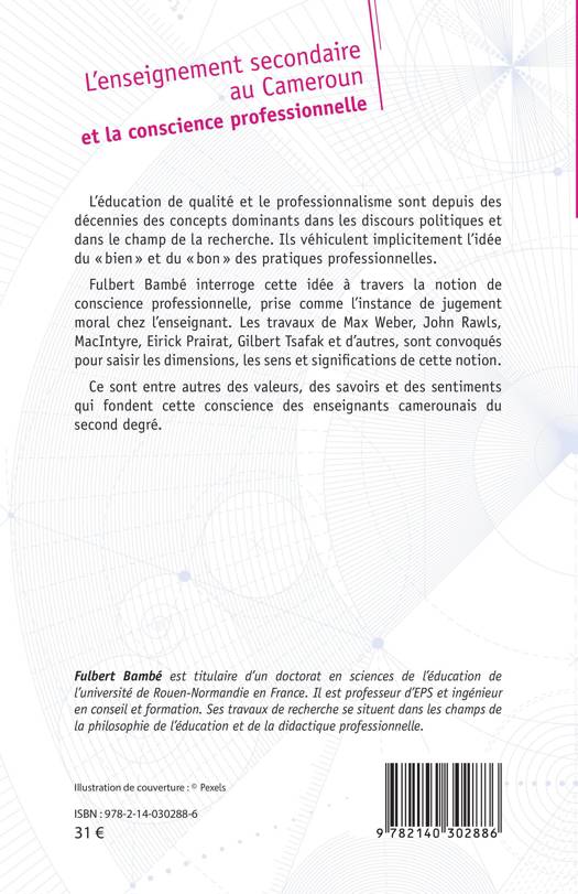 L'éducation de qualité et le professionnalisme sont depuis des décennies des concepts dominants dans les discours politiques et dans le champ de la recherche. Ils véhiculent implicitement l'idée du bien et du bon des pratiques professionnelles. Fulbert Bambé interroge cette idée à travers la notion de conscience professionnelle, prise comme l'instance de jugement moral chez l'enseignant. Les travaux de Max Weber, John Rawls, MacIntyre, Eirick Prairat, Gilbert Tsafak et d'autres, sont convoqués pour saisir les dimensions, les sens et significations de cette notion. Ce sont entre autres des valeurs, des savoirs et des sentiments qui fondent cette conscience des enseignants camerounais du second degré.