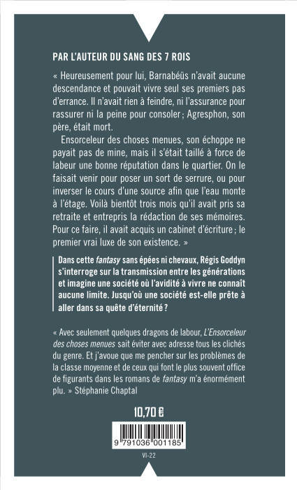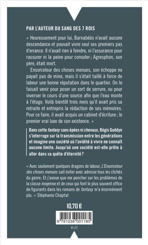 « Avec seulement quelques dragons de labour, L’Ensorceleur des choses menues sait éviter avec adresse tous les clichés du genre. Et j’avoue que me pencher sur les problèmes de la classe moyenne et de ceux qui font le plus souvent office de figurants dans les romans de fantasy m’a énormément plu. » Stéphanie Chaptal