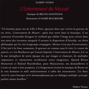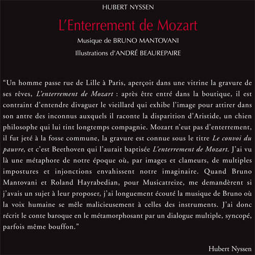 "Un homme passe rue de Lille à Paris, aperçoit dans une vitrine la gravure de ses rêves, L'enterrement de Mozart : après être entré dans la boutique, il est contraint d'entendre divaguer le vieillard qui exhibe l'image pour attirer dans son antre des inconnus auxquels il raconte la disparition d'Aristide, un chien philosophe qui lui tint longtemps compagnie. Mozart n'eut pas d'enterrement, il fut jeté à la fosse commune, la gravure est connue sous le titre Le convoi du pauvre, et c'est Beethoven qui l'aurait baptisée L'enterrement de Mozart. J'ai vu là une métaphore de notre époque où, par images et clameurs, de multiples impostures et injonctions envahissent notre imaginaire. Quand Bruno Mantovani et Roland Hayrabedian, pour Musicatreize, me demandèrent si j'avais un sujet à leur proposer, j'ai longuement écouté la musique de Bruno où la voix humaine se mêle malicieusement à celles des instruments. J'ai donc récrit le conte baroque en le métamorphosant par un dialogue multiple, syncopé, parfois même bouffon."