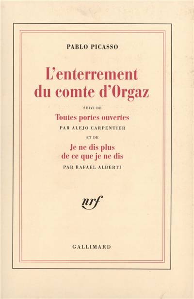Picasso a souvent écrit des poèmes, tantôt en français, tantôt en espagnol. L'enterrement du comte d'Orgaz, qui emprunte son titre au célèbre tableau du Greco, est un long poème d'inspiration surréaliste qui a été publié à Barcelone, en 1970. Alejo Carpentier l'a traduit en français. Le texte de Picasso est suivi d'un important poème de Rafael Alberti qui est un hommage à Picasso. Il est traduit lui aussi par Alejo Carpentier. Il s'y ajoute un texte écrit en français par Carpentier lui-même, et où le grand écrivain cubain, dans une prose lyrique, résume, par un survol saisissant, toute l'oeuvre picturale de Picasso.