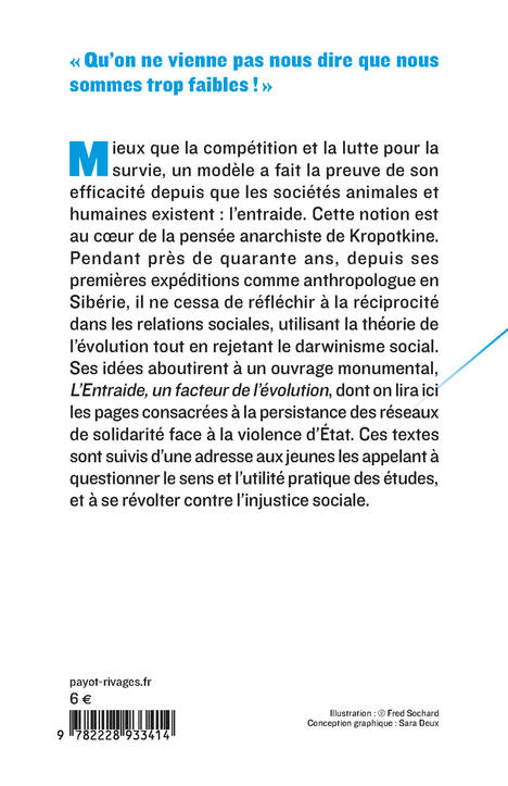 Mieux que la compétition et la lutte pour la survie, un modèle a fait la preuve de son efficacité depuis que les sociétés animales et humaines existent : l'entraide. Cette notion est au coeur de la pensée anarchiste de Kropotkine. Pendant près de quarante ans, depuis ses premières expéditions comme anthropologue en Sibérie, il ne cessa de réfléchir à la réciprocité dans les relations sociales, utilisant la théorie de l'évolution tout en rejetant le darwinisme social. Ses idées aboutirent à un ouvrage monumental, L'Entraide, un facteur de l'évolution, dont on lira ici les pages consacrées à la persistance des réseaux de solidarité face à la violence d'État. Ces textes sont suivis d'une adresse aux jeunes les appelant à questionner le sens et l'utilité pratique des études, et à se révolter contre l'injustice sociale.