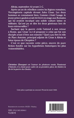 Alésia, septembre 52 avant J.-C. Après un an de rébellion contre les légions romaines, Vercingétorix capitule devant Jules César. Les deux hommes se connaissent bien. Comme c'était l'usage, le jeune prince gaulois avait été livré en otage aux Romains qui lui avaient inculqué une solide culture latine et militaire. Qu'ont pu se dire les deux généraux lors de leurs retrouvailles ?Sachant que la guerre civile l'attend à son retour à Rome, que César va t-il proposer à celui qui fut son disciple avant d'être son ennemi ? Quel a pu être le rôle de Marc-Antoine, principal adjoint de César à Alésia et futur époux de Cléopâtre ?C'est ce que raconte cette pièce, oeuvre de pure fiction fondée sur les hypothèses historiques les plus vraisemblables.