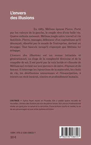 En 1983, Mélissa épouse Pierre. Porté par les valeurs de la gauche, le couple rêve d'une belle vie. Quatre enfants naissent. Mélissa jongle entre travail et vie familiale. Pierre, manager, défenseur d'un capitalisme qu'il dénonçait, absorbé par le monde de l'entreprise, devient un étranger. Tout bascule lorsqu'il s'aperçoit que Mélissa lui échappe. L'envers des illusions est un roman intimiste et générationnel, un éloge de la complexité féminine et de la conquête de soi. Il est porté par la voix lucide et vibrante de Mélissa qui revient sur son parcours de mère, d'épouse et de femme. Il interroge les injonctions de la maternité, les choix de vie, les désillusions amoureuses et l'émancipation, à travers un récit incarné, sincère et profondément humain.
