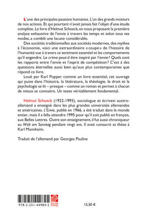 L'une des principales passions humaines. L'un des grands moteurs de nos actions. Et qui pourtant n'avait jamais fait l'objet d'une etude complete. Le livre d'Helmut Schoeck, en nous proposant la premiere analyse exhaustive de l'envie a travers les temps et selon tous ses modes, a comble une lacune considerable. Des societes traditionnelles aux societes modernes, des mythes a l'economie, voici une extraordinaire coupe de l'histoire de l'humanite vue a travers ce sentiment essentiel et les comportements qu'il engendre. Le crime peut-il etre inspire par l'envie ? Quels sont les rapports entre l'envie et l'esprit de competition ? C'est a des questions eternelles aussi bien qu'aux plus contemporaines que repond ce livre.Loue par Karl Popper comme un livre essentiel, cet ouvrage qui puise dans l'histoire, la litterature, la theologie, le droit et la psychologie se lit - presque - comme un roman et permet a chacun de mieux se connaitre. Un texte veritablement fondamental.